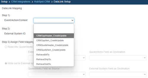 Step 2: On the next window (DataLink Mapping), change the first drop-down menu to CRMOppHeader_CreateUpdate to choose to push a DocumentHeader field from QuoteWerks to the Zoho Deal.