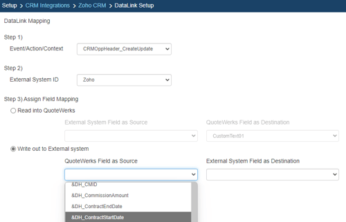 In the following example we are going to walk through how to push the Contract Start date field from QuoteWerks and have it populate a custom field in Zoho. You can push this and many other fields through the DataLink mapping window. You will need to create a new DataLink for each field you would like to populate however.