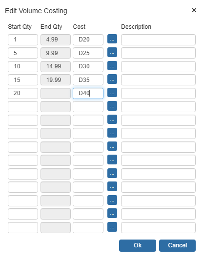 Once you select this method, the Edit Volume Costing window will appear to let you set the start quantity, end quantity, and product cost for that quantity range: