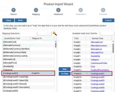 You can use the Import Products feature to import volume cost values into a native product database. In order to do so you will want to have fields in your import file that can be mapped to the CostingLevel01-15 fields in the QuoteWerks system. These fields should contain your costing level lower quantity, costing level upper quantity and costing level amount. As such, if you are creating a costing level that accounts for a volume of 1-5 with a cost level amount of $5, you will want to format the cell to include the following [1-4.99 5.00]. For a costing level that accounts for a volume of 1-10 with a cost level amount of $4, you will want to format the cell to include the following [5-9.99 4.00], etc.