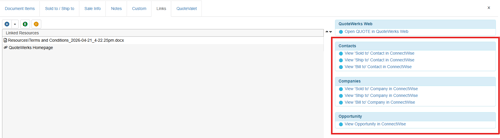 The other section is called Auto-Links in which contacts, opportunities, activities, and tickets are linked dynamically from the CRM/PSA selected in QuoteWerks.