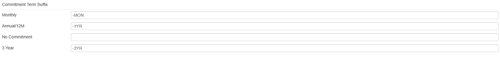 Here you can set how to amend the Pax8 part number to reflect the items commitment terms. You can set a 3-character suffix for each commitment term which will be placed at the end of the Pax8 part number and billing terms suffix.