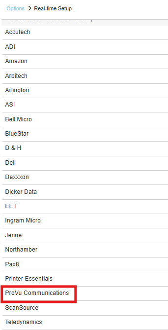 1. To setup Printer Essentials Real-time pricing and availability navigate to Setup > Options > Real-time and select ProVu Communications.
