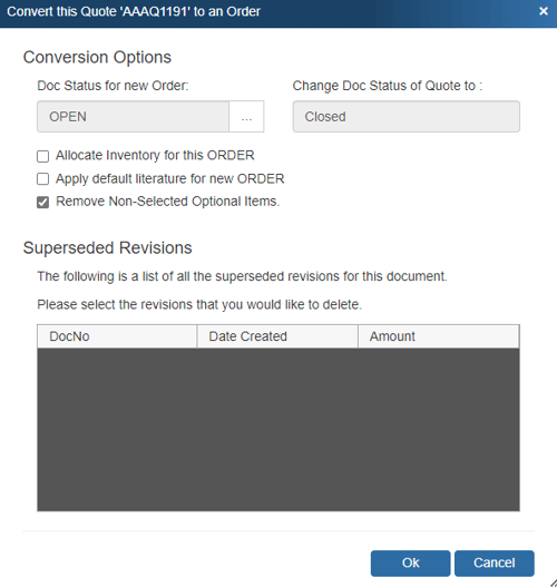 Also, the “Convert this Quote to an Order” window will display the new status of the quote and the status of the New Order. Lastly, if you have any revisions of the quote, they will be displayed and you will have the option of deleting those revisions by putting a check mark next to the Doc No.