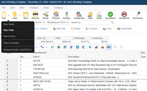 Users can also create new Order documents by clicking on the File-> New menu option or by clicking on the split-menu arrow and selecting the "New Order" option. If a user creates an order this way, the Convert to Order window will not appear since the document is being created as an order.
