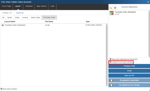 When you select a purchase order type of print layout, the “Create PO for each Vendor” checkbox will appear above the list of layouts: