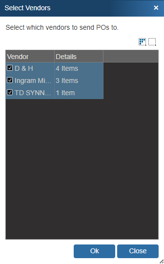 This window displays a list of Vendors on the Order and will allow you to select the Vendor(s) that you want to create PO’s for. Finally, click on the [Ok] button to create the purchase order for the first Vendor.