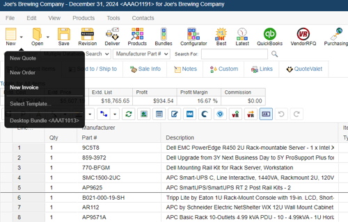 Users can also create new Invoice documents by clicking on the File-> New menu option or by clicking on the split-menu arrow and selecting the "New Invoice" option. If a user creates an order this way, the Convert to Invoice window will not appear since the document is being created as an invoice.