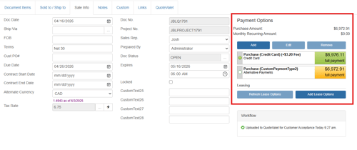 The Sale Info tab also includes Payment Options for the quote or proposal. Setting up different payment options is very useful for anyone who accepts multiple payment types for customers. You can set default payments types for each document or customize the payment options on a per quote basis. Current payment options include: Credit Card, Check, ECheck (ACH), PayPal, Wire Transfer and two custom payment options.