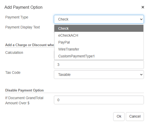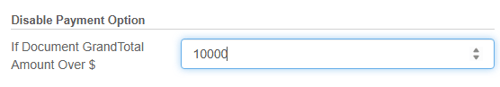 5. Users also have the option to disable a payment option if the Document total is over a certain dollar amount. Simply type in the value where you wouldn't want this payment option to be available. If the Grand Total of the document exceeds what is set here, this payment option would not be available to use on this quote.