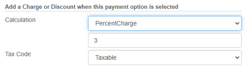 4. Next, if you want to add a percent charge, percent discount, or a fixed charge for using the selected payment type you can set that up under the Add a Charge or Discount when this payment option is selected. For example, if it is legal in your region to charge a fee for using a credit card, you could set the calculation field to "PercentCharge" and then set it to "3". When this payment option is selected, it will automatically add a 3% surcharge to the payment total.