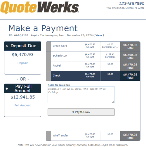 These payment options are specifically useful for QuoteValet users as your customers can select the payment method that's best for them, and after accepting the quote, will be brought to the payment screen based on their selection.