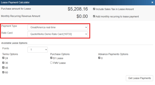 IMPORTANT: In order to add a Lease Payment Option, you will need to setup your leasing provider in QuoteWerks in the Leasing tab. If you are using GreatAmerica and have a Real-time module, you will setup the Real-time Leasing Integration in the Real-time setup window.