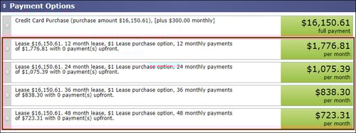 7. After you have made your selections, click on the [Get Lease Payments] button and your payment options will appear with check boxes next to them.