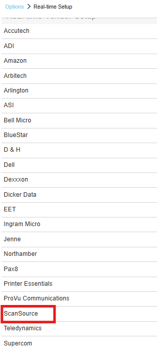 1. To setup ScanSource Real-time pricing and availability navigate to Setup > Options > Real-time Setup and select ScanSource.