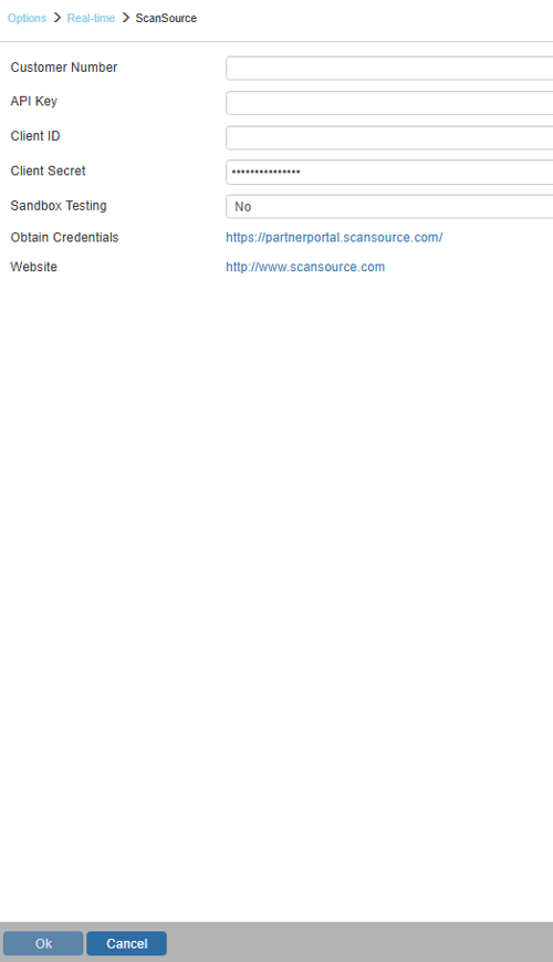 2. Input your Customer Number, API Key, Client ID, Client Secret, select whether or not you would like Sandbox Testing and click [OK]. How to get this information is outlined in the "Obtaining your ScanSource Credentials" section below.
