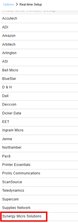 1. To setup Synergy Micro Real-time pricing and availability navigate to Setup > Options > Real-time and select Synergy Micro.