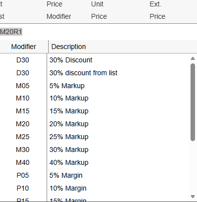 The rounding values supported include .01, .05, .10, 1, 5, 10, and 100. For example, putting in a modifier of "P20R1" would provide a 20% margin and round the Unit Price to the next highest whole dollar.
